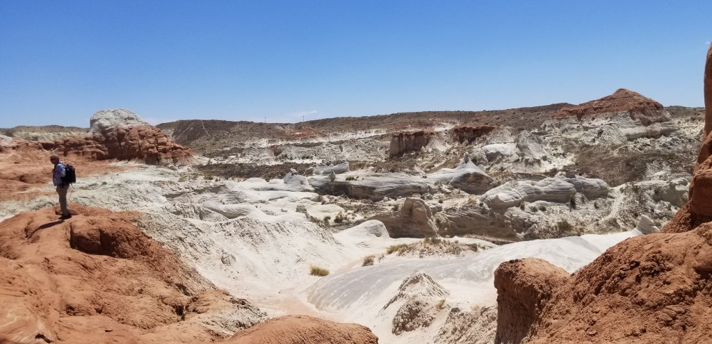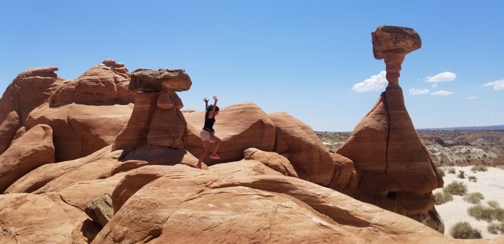 It is a 1.5 miles hike round trip. I noticed that the heat was intense, but I figured the water would get me through it. Halfway down less than a mile hike, I started feeling very tired and drained from the sun. I didn’t think much of it as I am an avid hiker, and I felt like 1.5 miles was easy, but with the sun, no matter how short a hike is, it is strenuous on the human body. It is an easy hike, it is kid-friendly, but I don’t recommend it during the summertime in Utah. Finally, at the end of the walk, I saw these rocks stocked up on each other, weird-looking rock formations and structures. Pretty amazing to see what nature and the years can create in a desert.